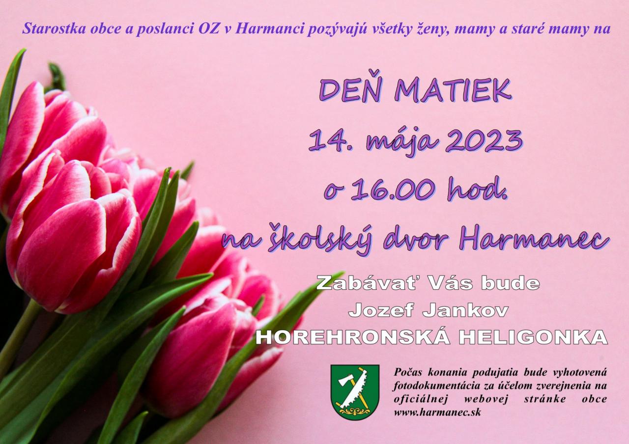 Starostka obce a poslanci OZ v Harmanci pozývajú všetky ženy, mamy a staré mamy na Deň matiek, ktorý sa uskutoční 14. mája o 16:00 hod. na školskom dvore v Harmanci.